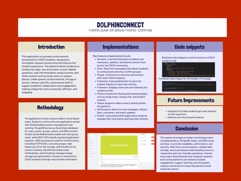 The CSUCI student network is a full-stack web application designed to provide a secure and collaborative space for the campus community. Built with React.js, Node.js, MongoDB, and Redis, the platform allows students to communicate, collaborate, and stay engaged with campus life in one place.